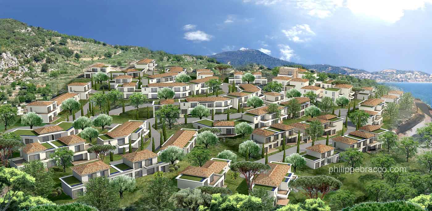 Le terrain étant en pente, l'Architecte a réalisé un tracé de voie au plus près du terrain naturel, dans le but d'éviter au maximum les murs de soutènement. Les maisons ont été disposées ensuite le long de ces voiries et les jardins ont été plantés d'oliviers, de cyprès florentins et de plantes méditerrannéenes.